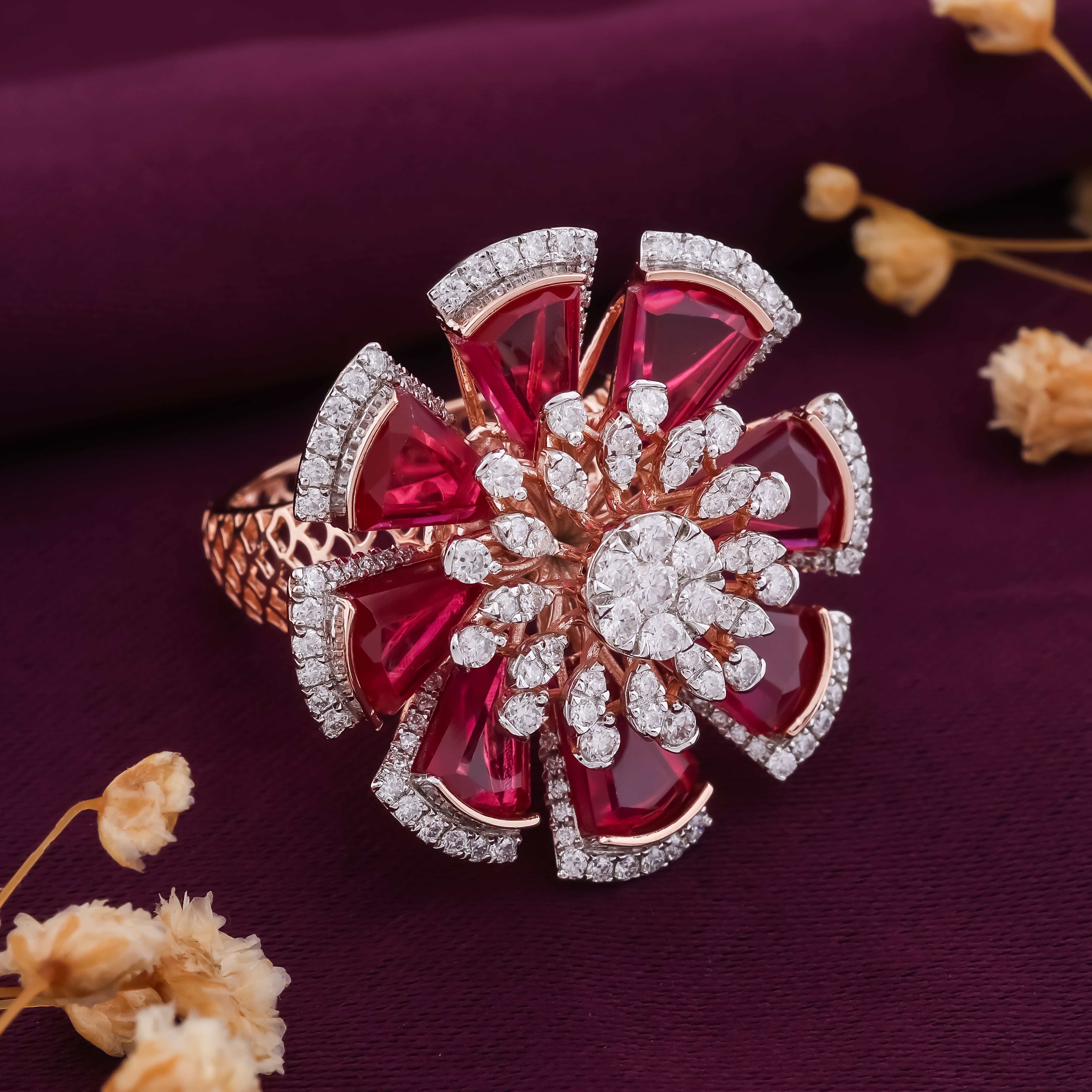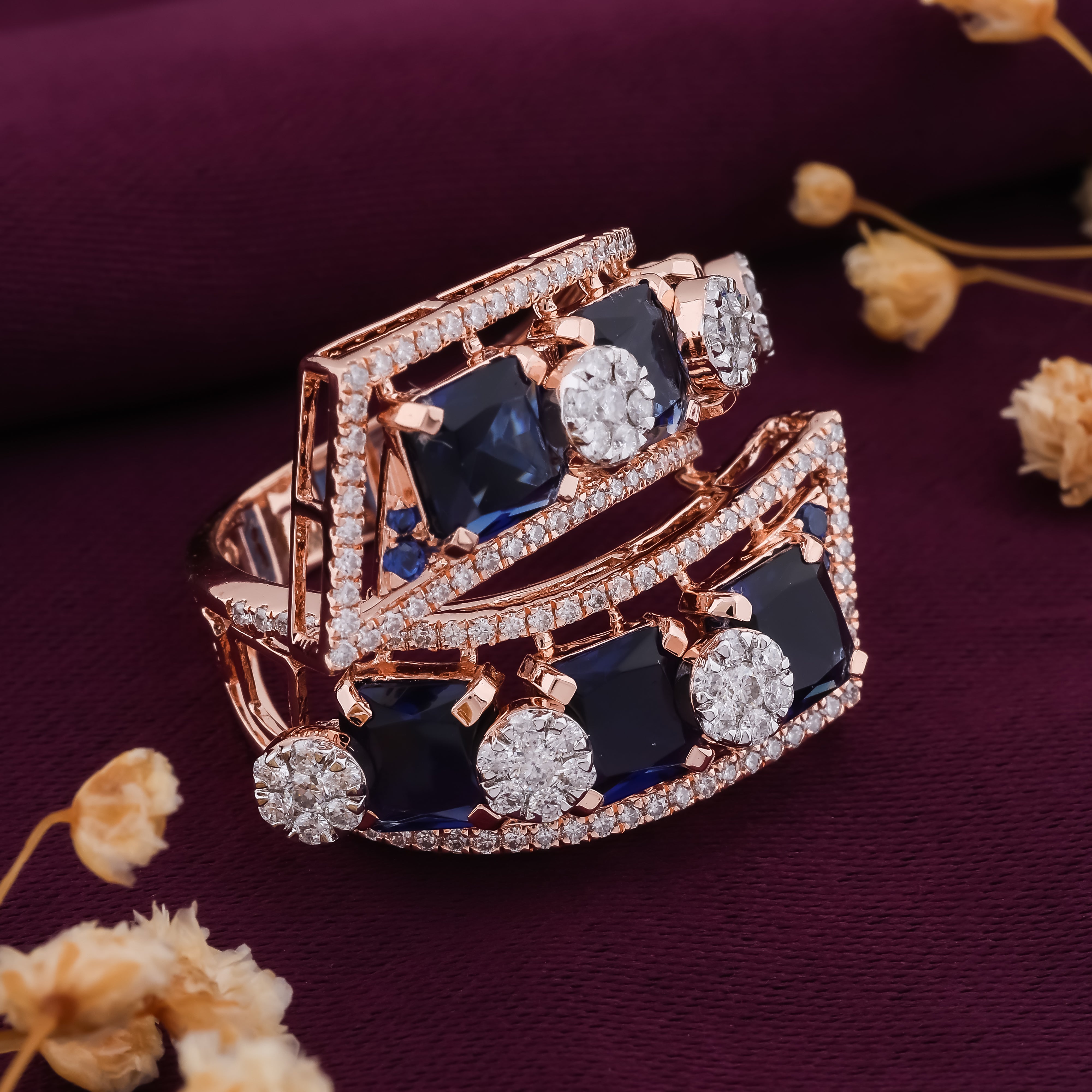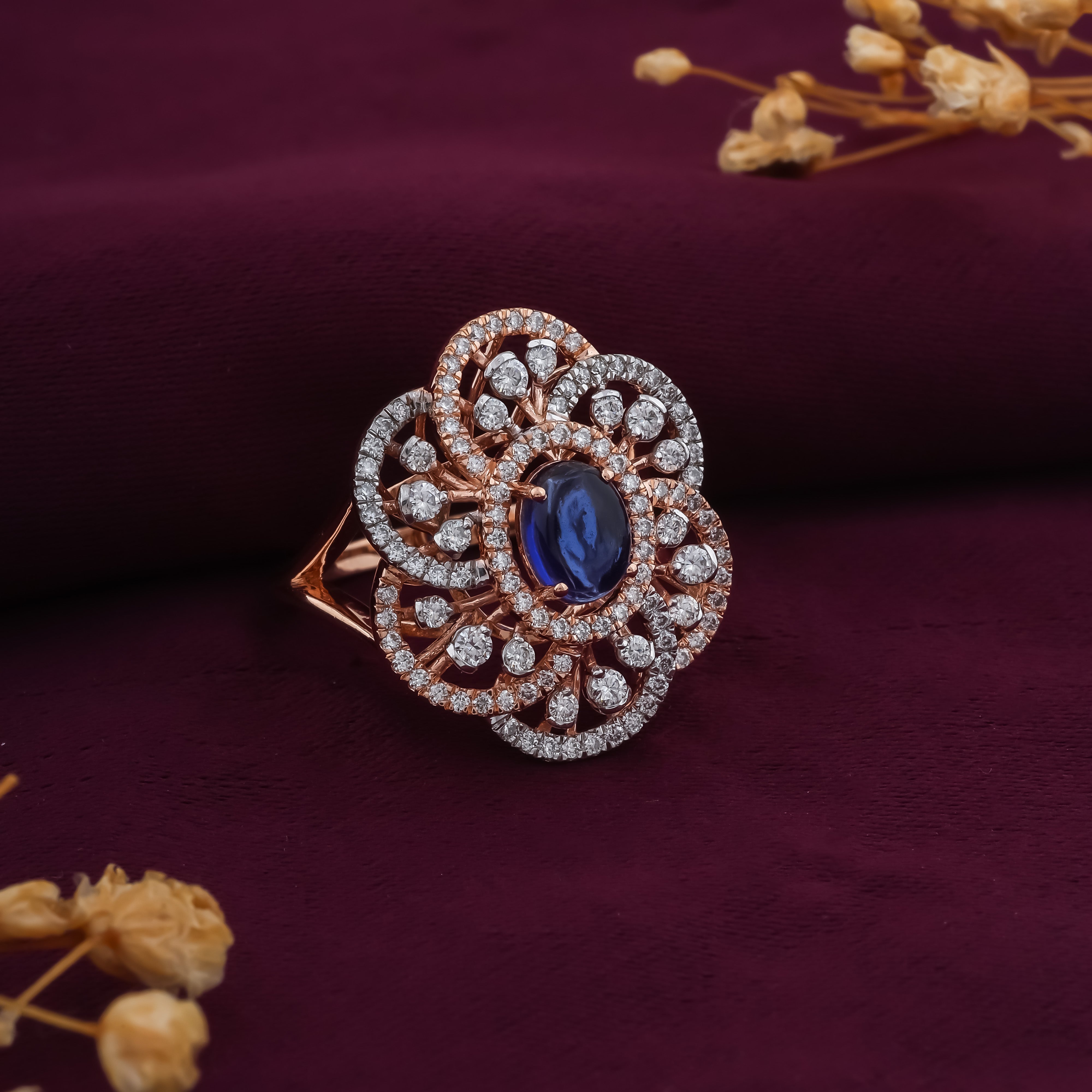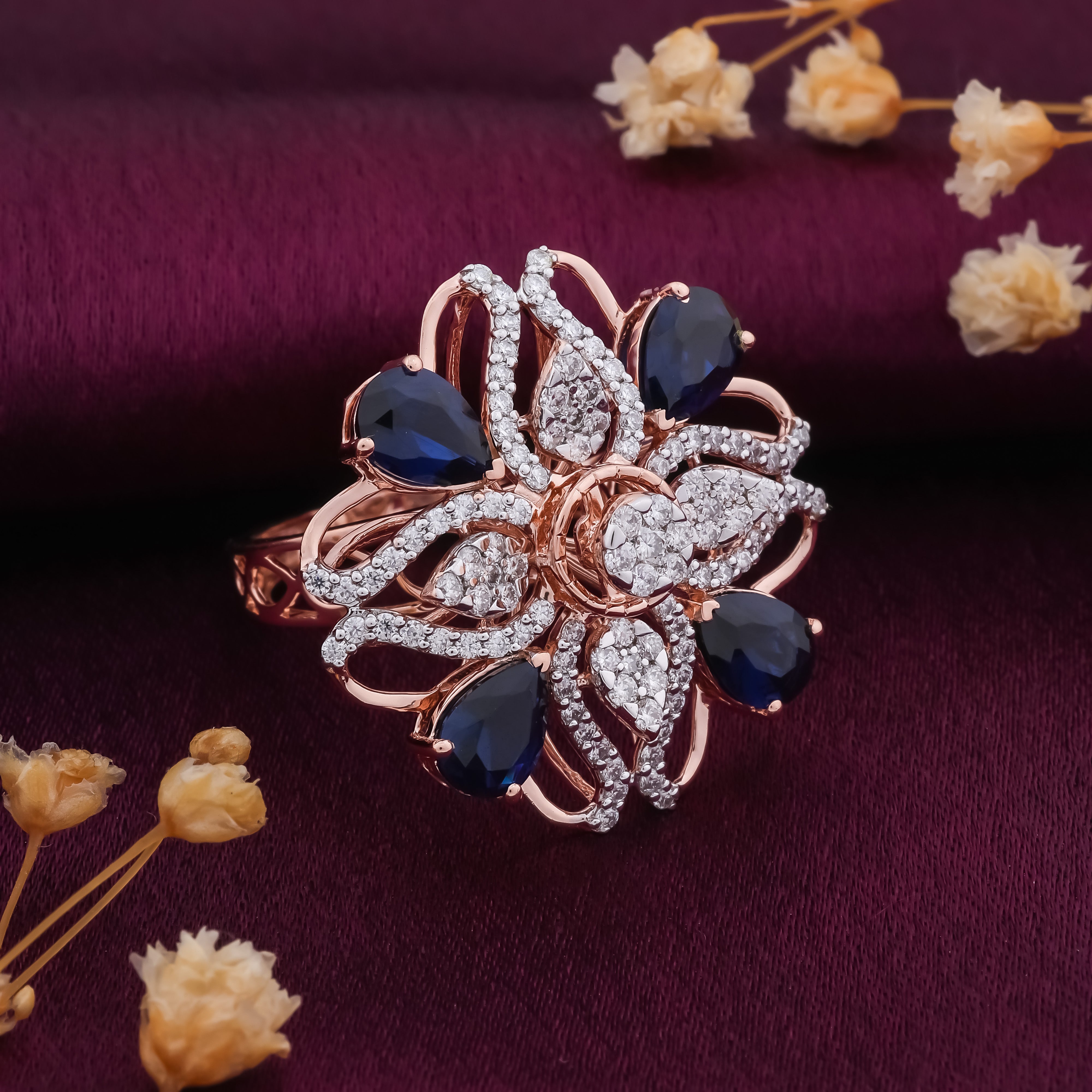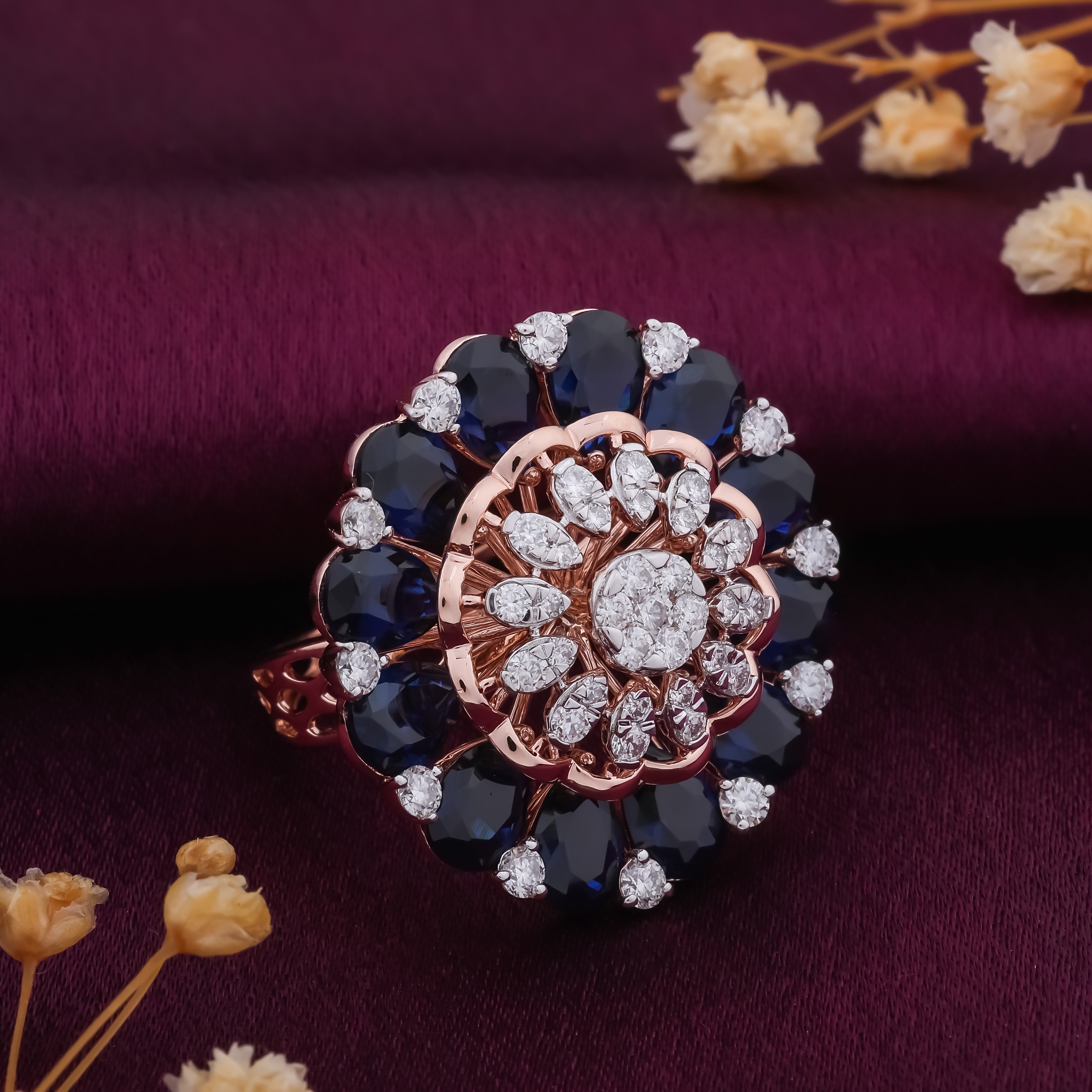 BOLD FLORAL DIAMOND RING WITH NAVY BLUE STONE
