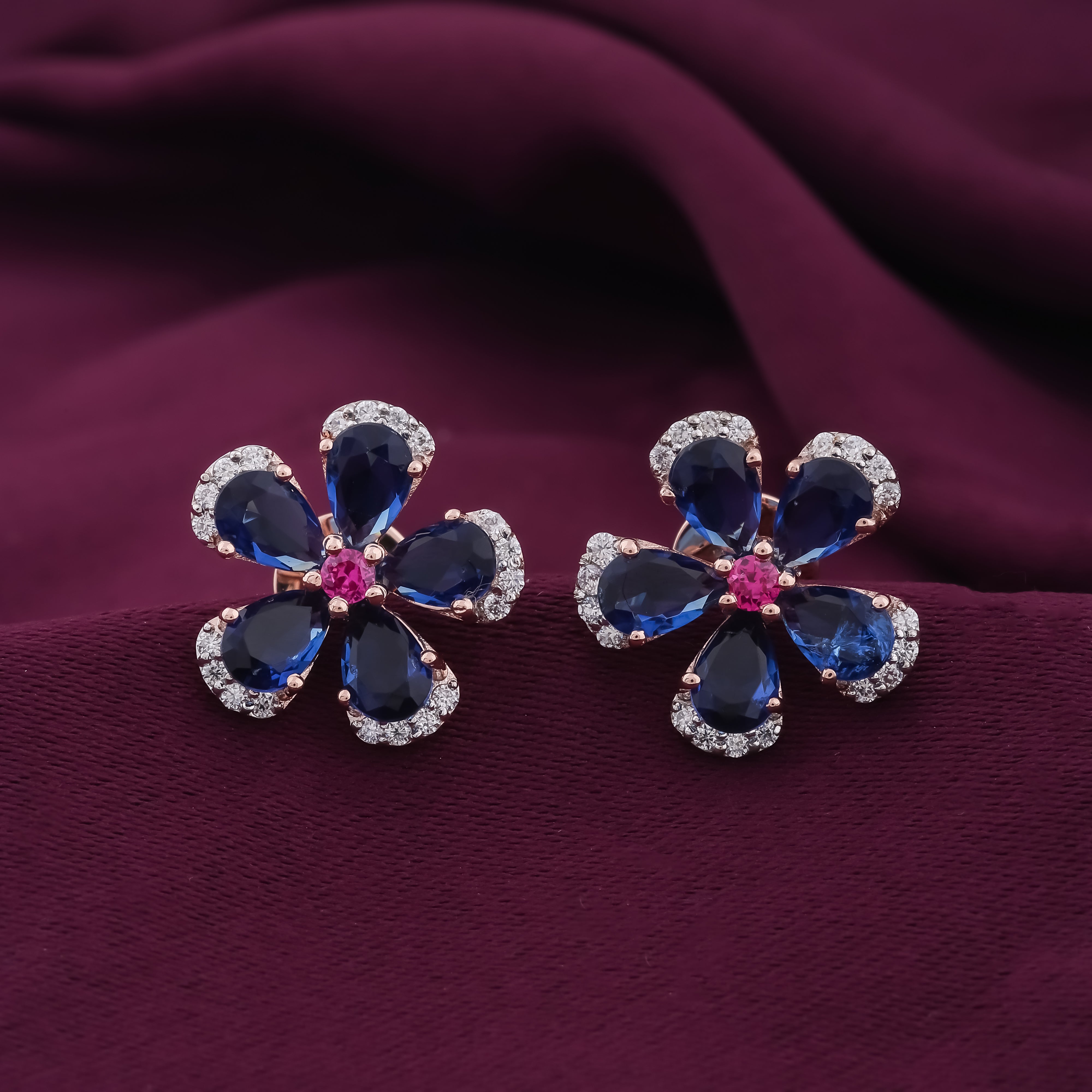 Blue & Rose Gold Plated Floral Studs Earrings