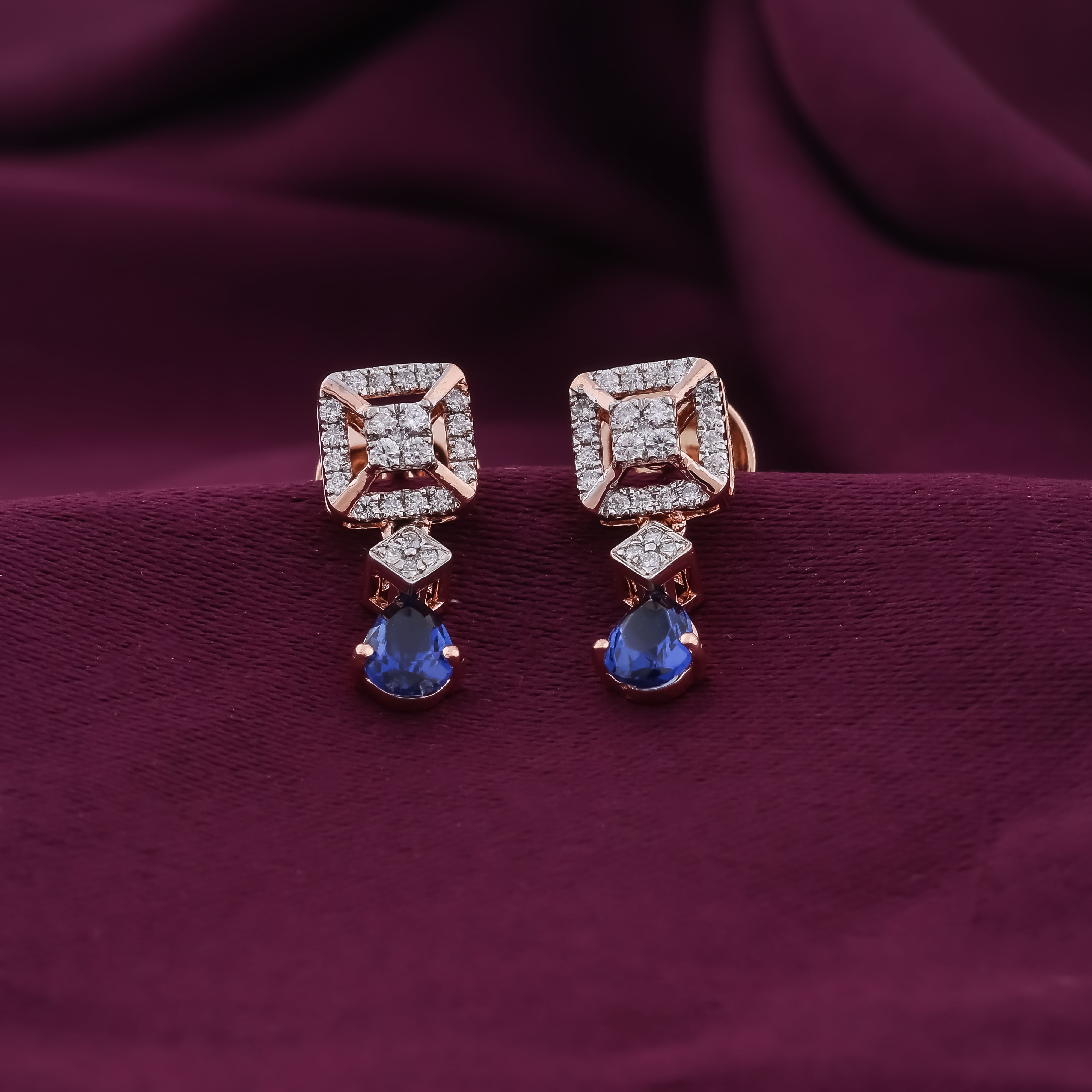 Square Shape Diamond Box And Hanging Blue Stone Earrings