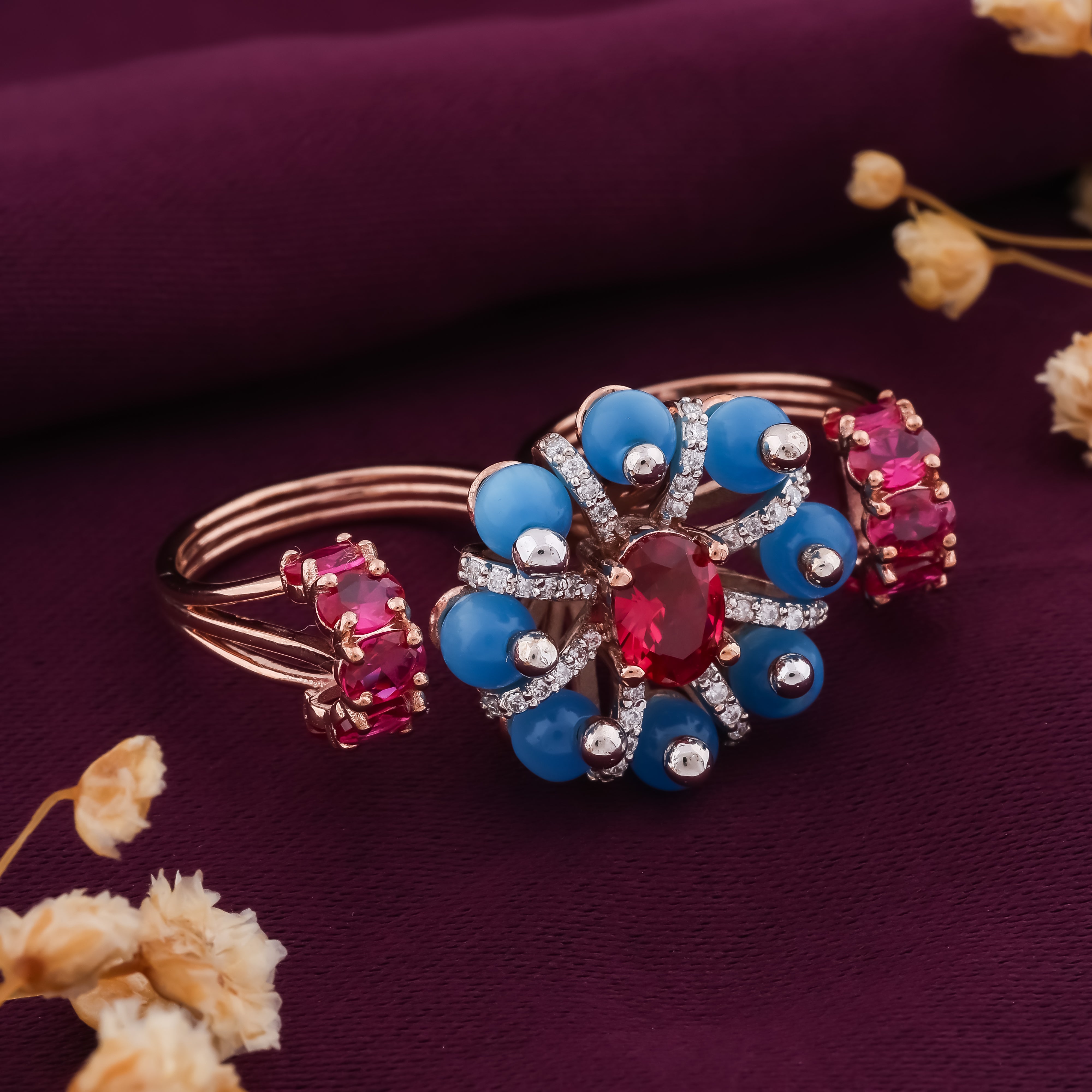 Blue Color Stone With Centre Diamond Flower Ring
